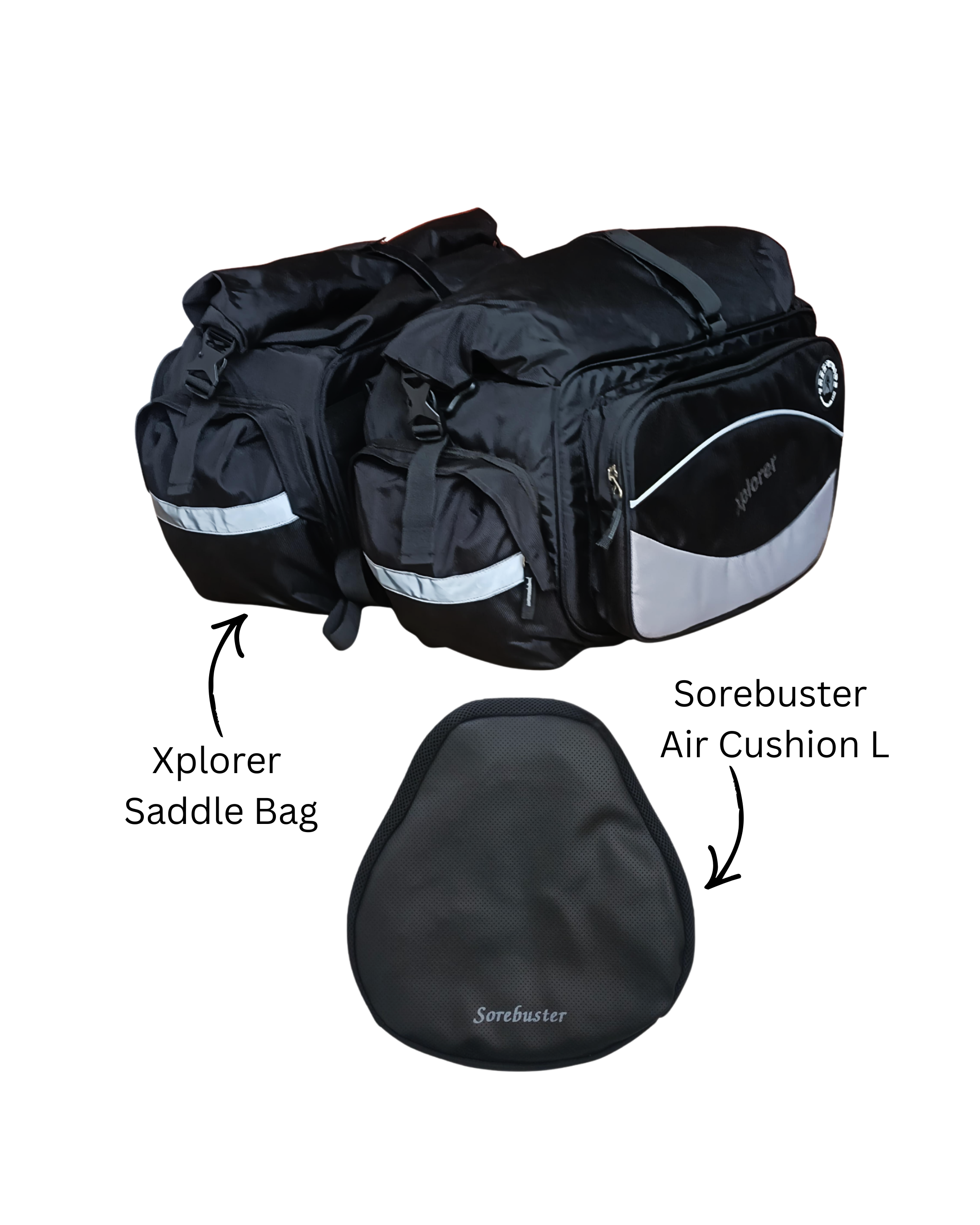The Xplorer saddle bag provides compact and secure storage for your luggage while you ride. Paired with it, the Sorebuster air cushion adds extra comfort by reducing pressure and absorbing shocks, making long rides smoother and more enjoyable.