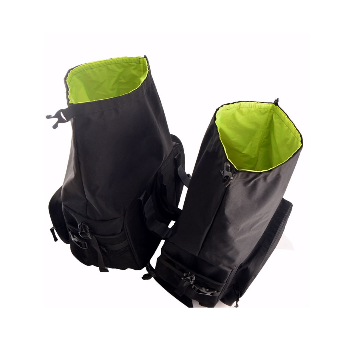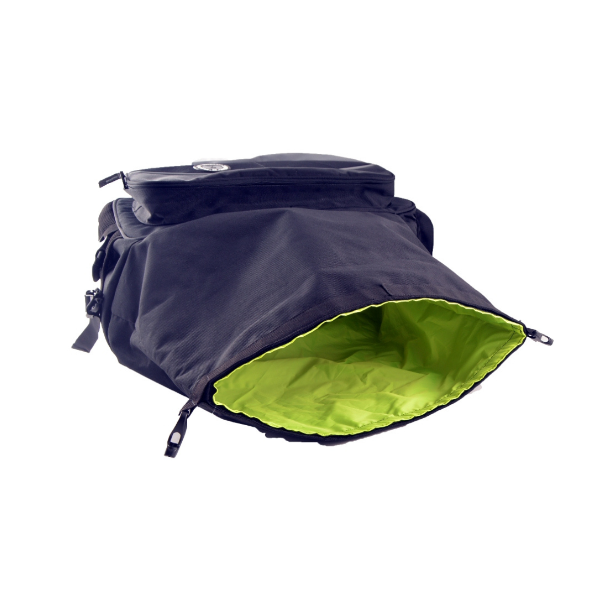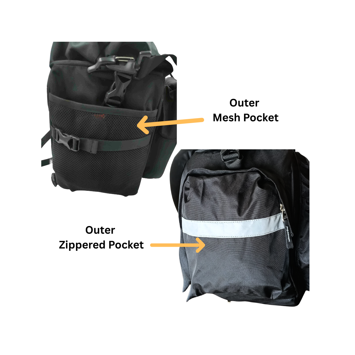 COMPARTMENTS & STORAGE: Each bag has a main compartment with roll-type closure, 2 zippered outer pockets – one on the front and other on the side and a mesh bottle holder with elastic hems. The maximum capacity of each bag is 34L, but can be adjusted with the roll-type closure.